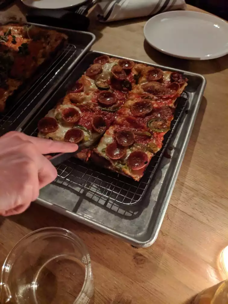 Craving some basic food after returning from the UK we stopped in on a late Sunday afternoon. No tables available but we grabbed two seats at the bar. The pizza (‘Detroit style’) was very very good. We had the Luca enhanced with sausage and pepperoni on half of it. A fine glass of Pinot Noir to accompany. Must return for the burger that everyone raves about. Ever so long waits if you don’t have a reservation so book or go ready to wait or get lucky and snag a bar seat