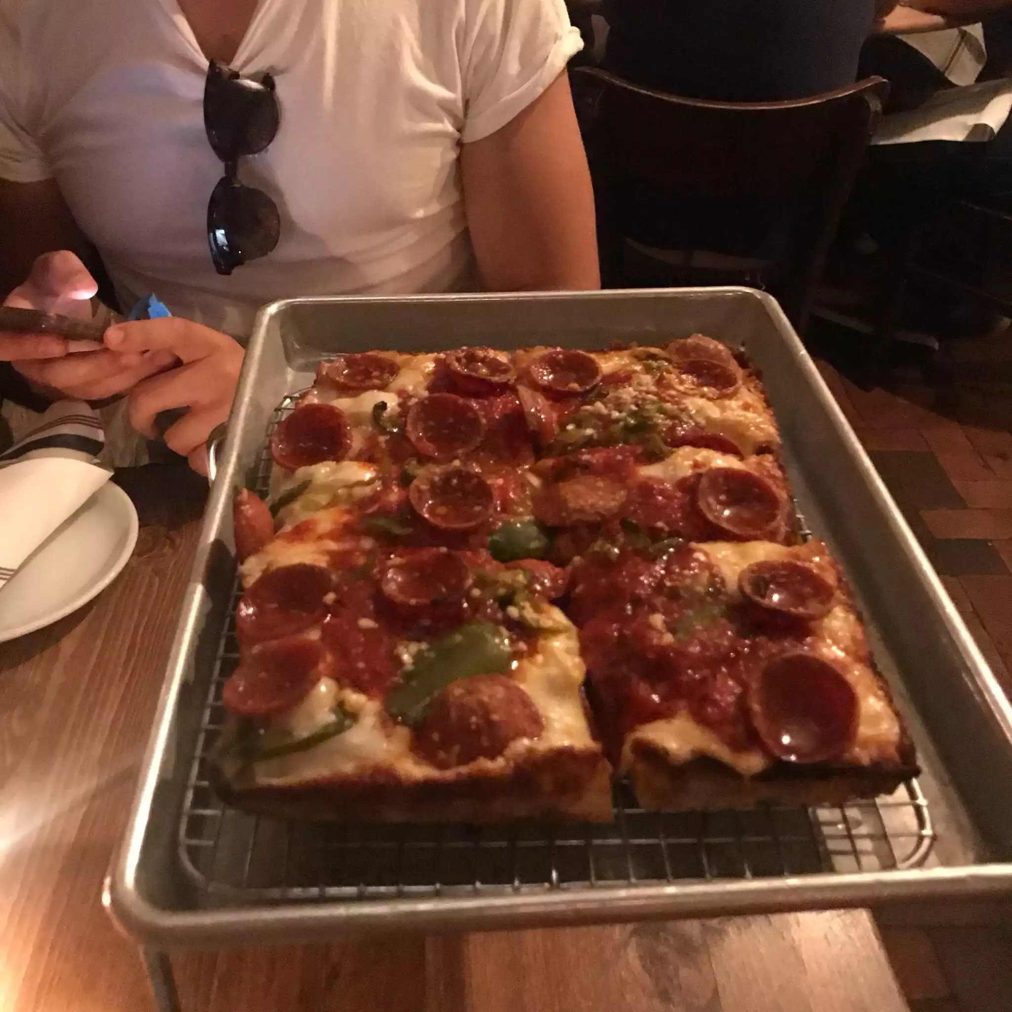 I made a reservation for dinner here after trying their Brooklyn location twice. We love the pizza there, especially the Colony. Unfortunately I didn't realize this was only Detroit style pizza and you can't get the thin crust they serve in Brooklyn. For that reason, I wasn't a big fan this time. However, the location is great and the restaurant itself charming. They seated us in their lower basement level which I didn't care for, I'd request the upstairs if I was making a reservation again. Overall recommend the Brooklyn restaurant.