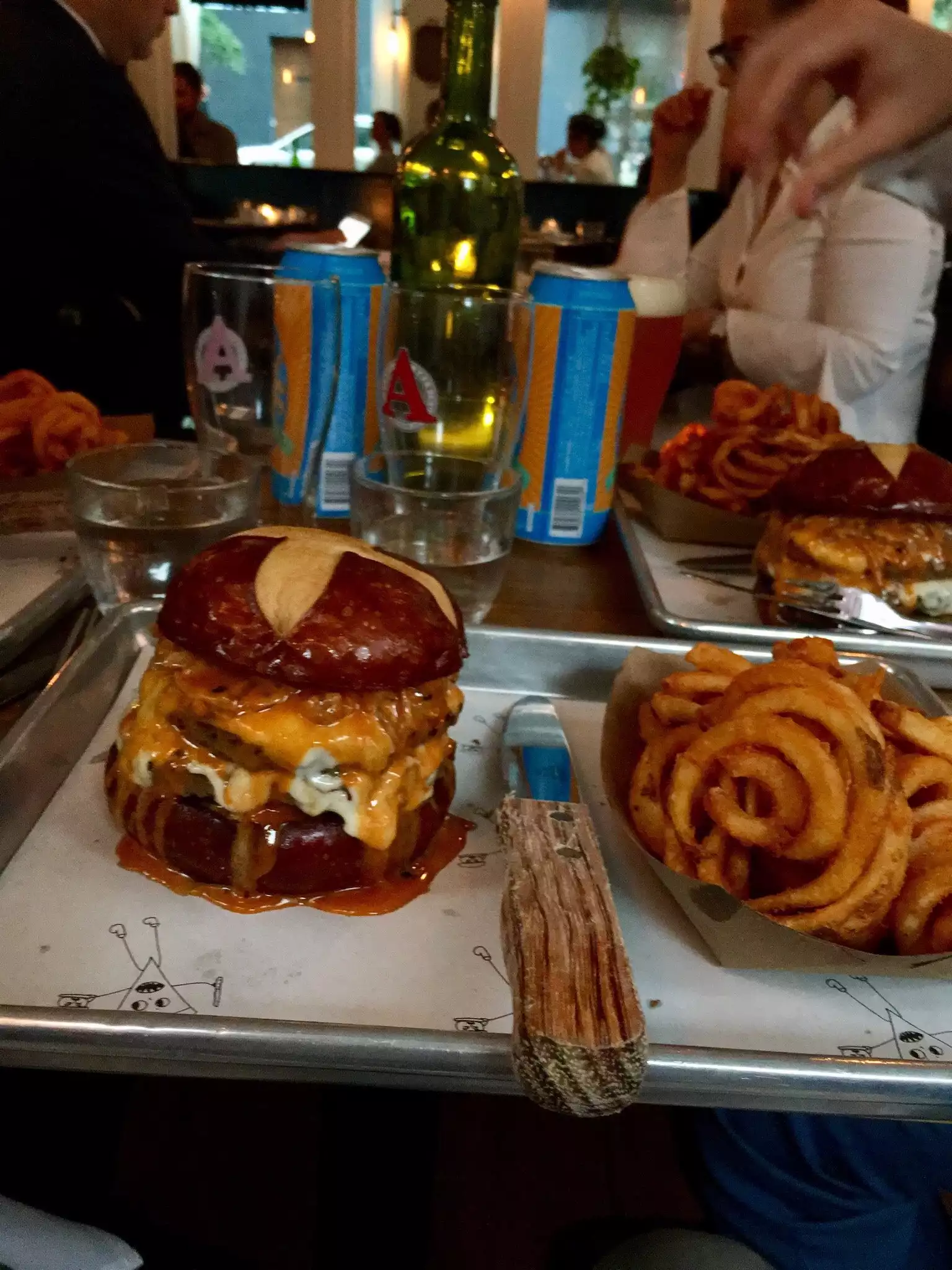 The burger is sooo Good Im scared for life... I don't know how I will eat another burger and not think of this one it's savory and sweet the bun is soft and buttery it has an amazing mic of flavors its so good the only have one choice of burger and do yourself and DO NOT MESS WITH IT! Order it as is!!! On the other hand somehow leave space to try the colony pizza its an amazing spicy jalapeño pepperoni crunchy pizza like no other!!! The wait is literally FOREVER but ohh so worth it... they take reservations on Resy but for big parties normally you would have to do it well in advance.. just to conclude how good this place is we went for lunch one day and came back for dinner the next day!!