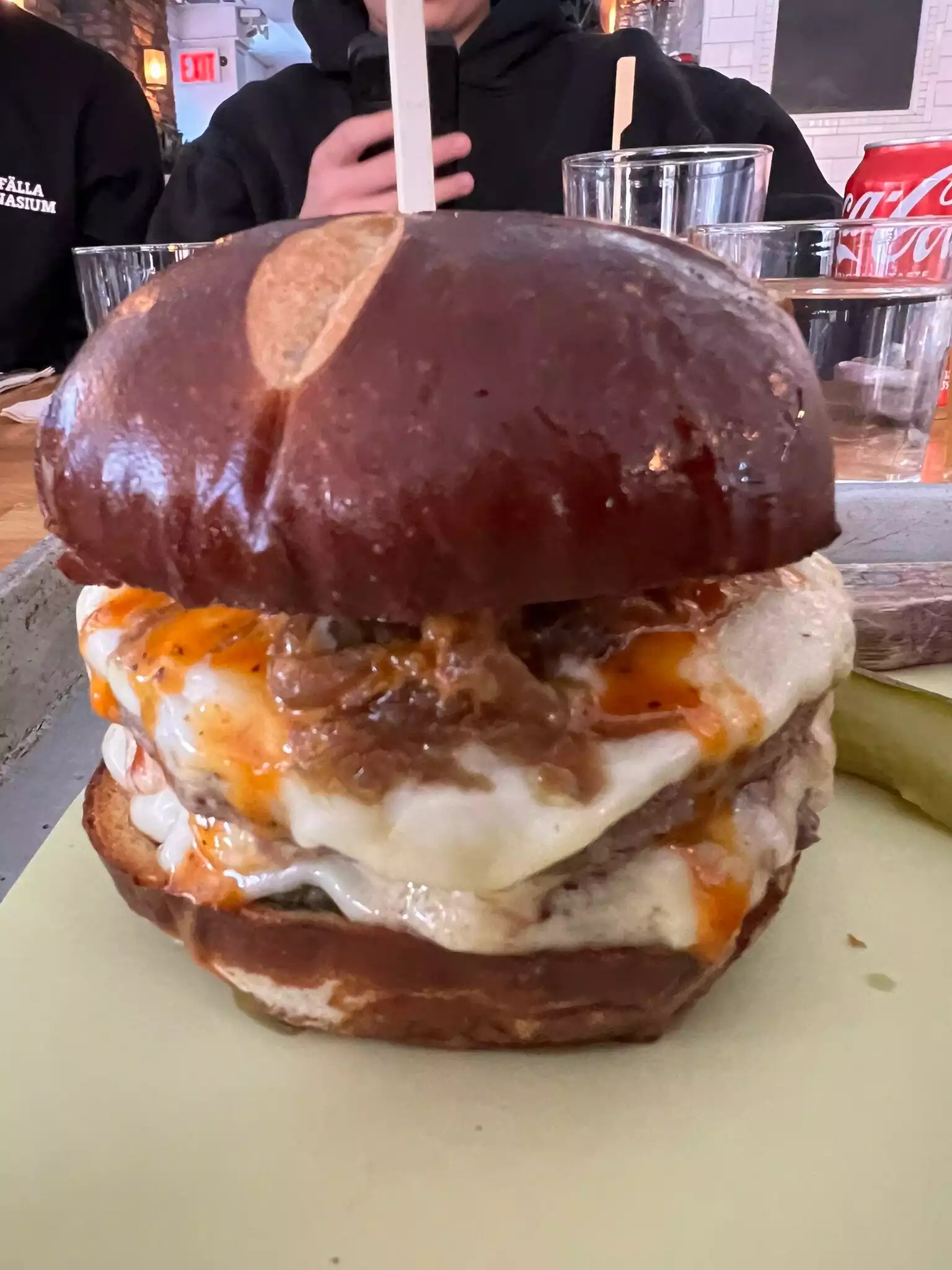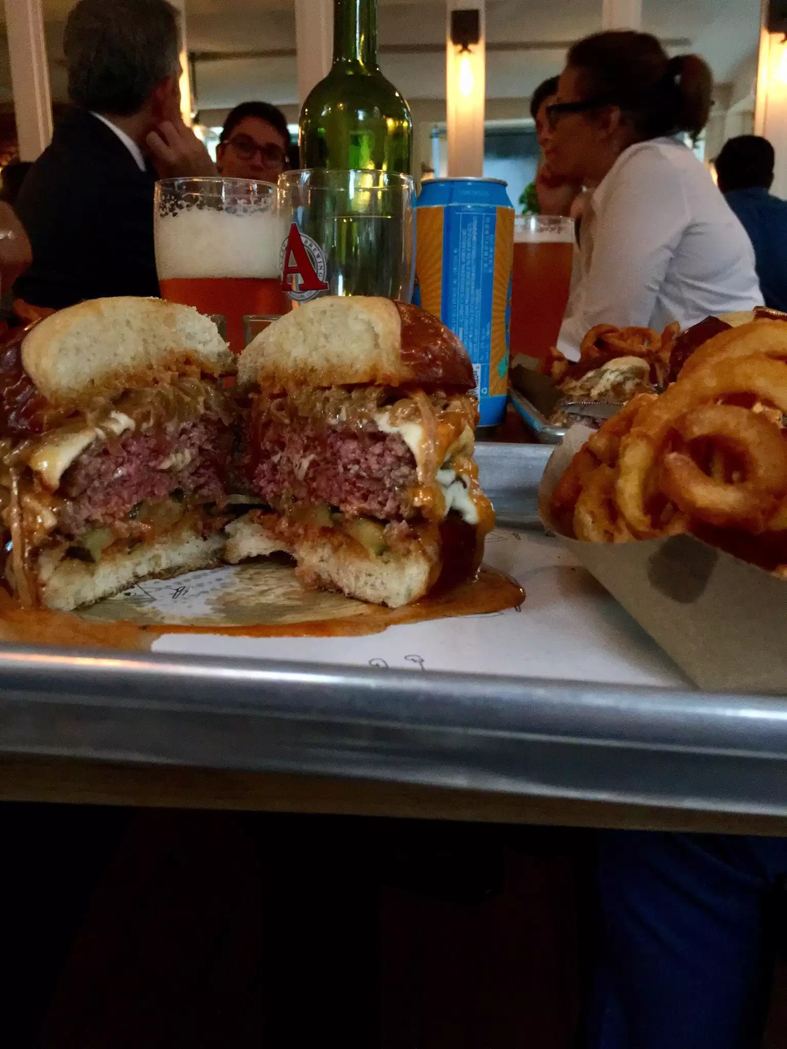 Simple restaurant with basic decor and atmosphere. We came mainly to try their famous burger and we were not disappointed at all. dry-aged patty covered in year-old Vermont cheddar and caramelized onions and served on a pretzel bun. Something that “shouldn’t work, but it does. light. The secret is in the sauce Surprisingly light. We also tried the pizza which was ask great.
