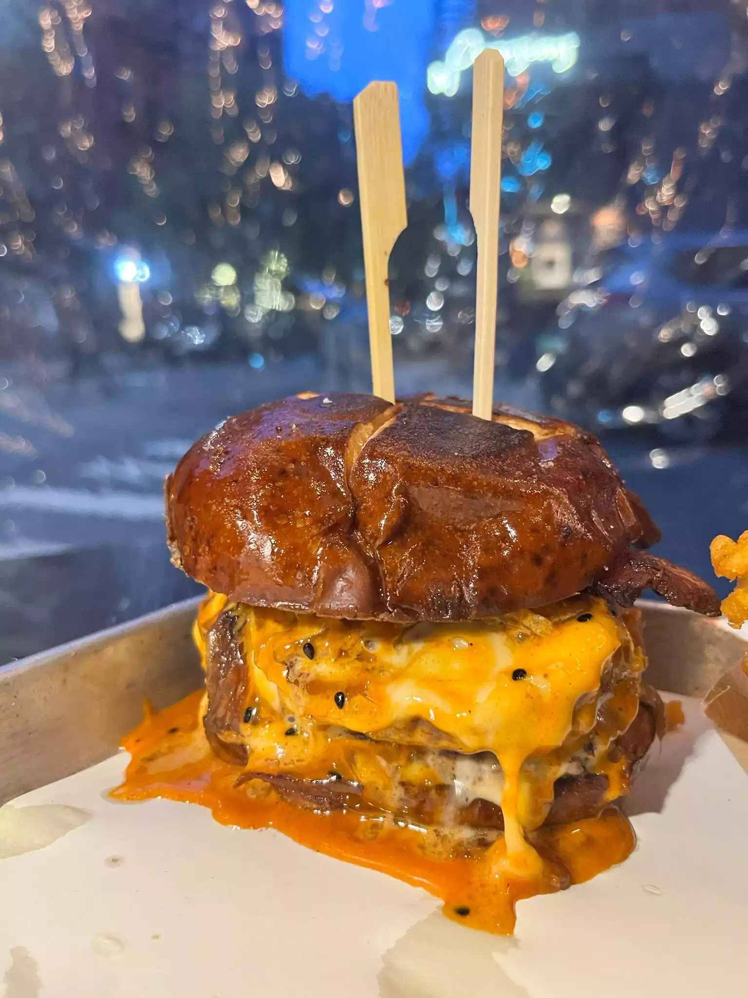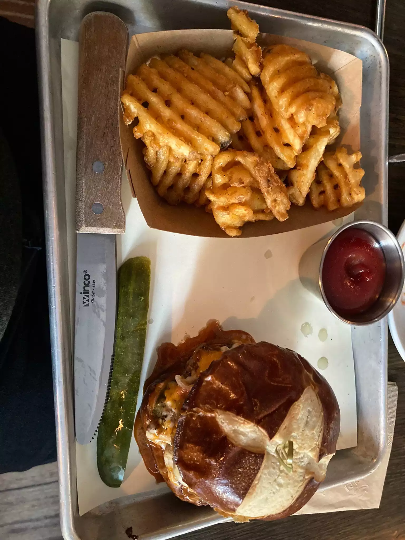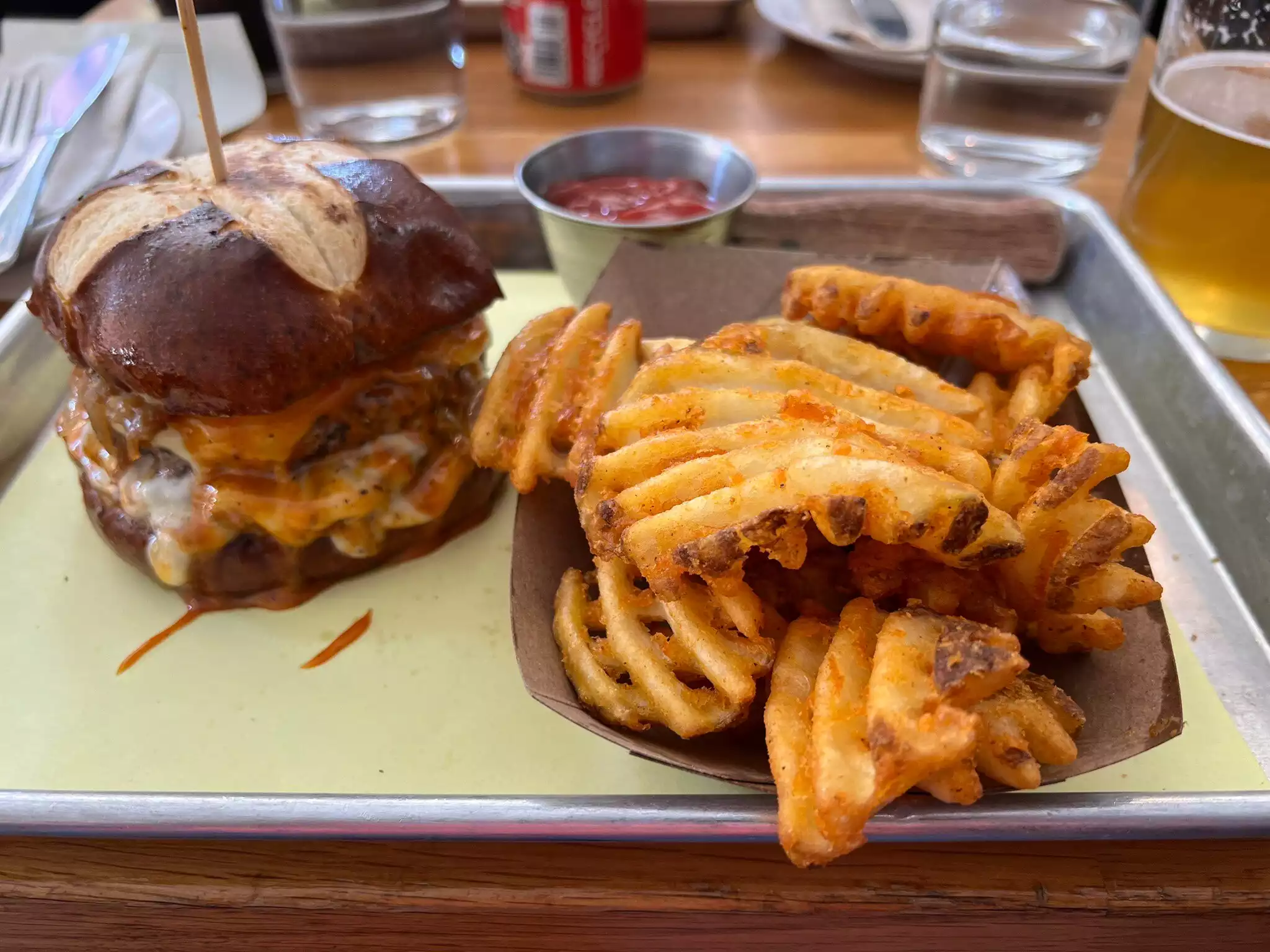 This place has an incredible double stack burger, delicious... with their proprietary dressing and prepared in a pretzel bun. Quite original! The curling fries were also very good.