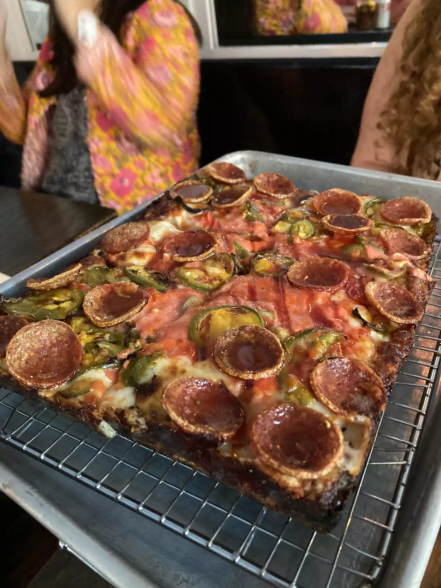 One of my favorite pizzas in the city! The roni cups and the hot honey...SO. GOOD. Go here if you want something other than your traditional NY slice. Square pan pizza with a little thickness. Promise you'll eat every bite!.