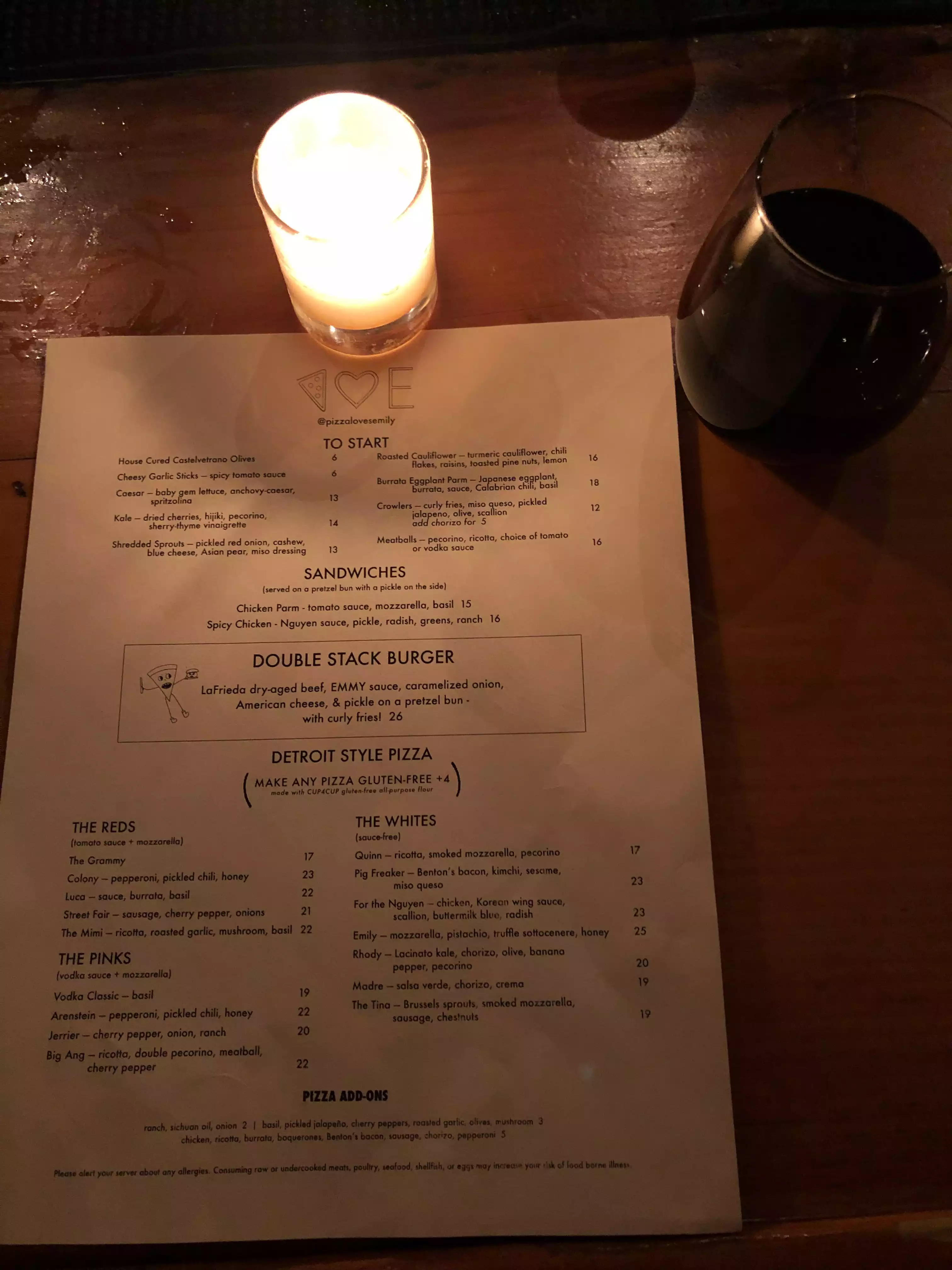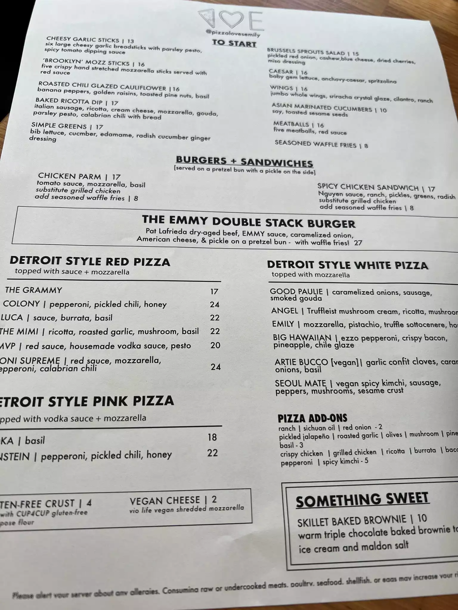 We weren’t sure what to expect when we wandered into Emily early on a Friday evening. Seated immediately in the cozy downstairs. We were pleasantly surprised to see the pizza is Detroit-style - our favorite. And it certainly delivered. Baked to perfection. Also had the kale salad, which was yummy. One pizza and one salad was plenty for the two of us. Highly recommend!