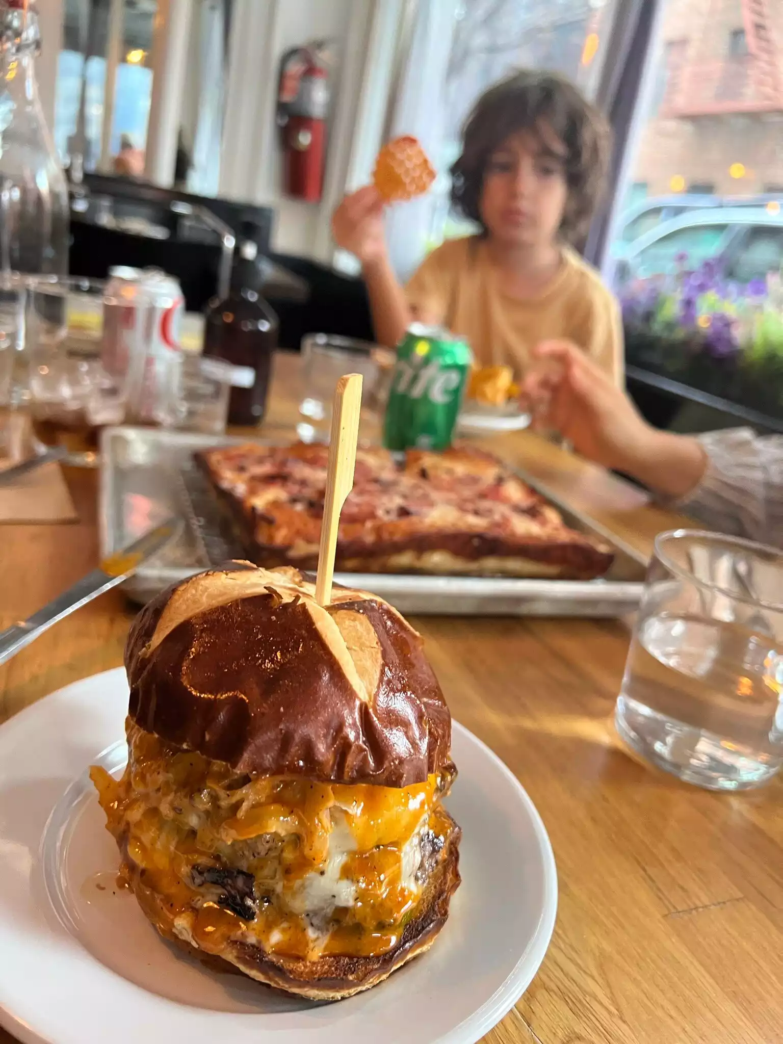 This place a phenomenal burger and great pizza! The sauce on the burger enhanced the juicy flavor, and was amazing! Many pizza choices, so we had a “Detroit style” spicy pepperoni, and a white pizza with truffles - both excellent choices. Sometimes you can caught up eating trendy or exotic food in NYC, but other times you just want an great burger and slice - you get both of those here.