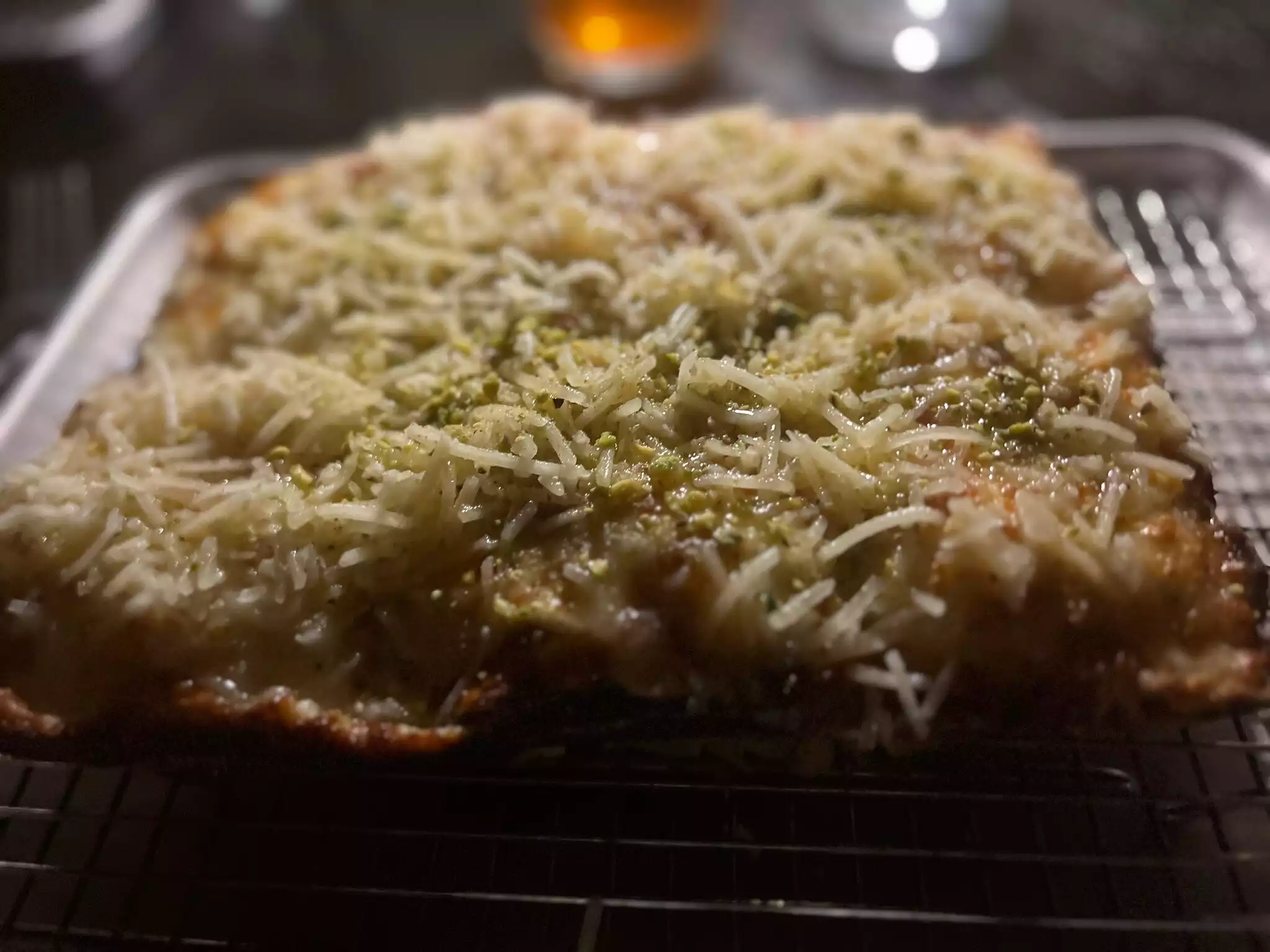 I came here for take out in the morning and was disappointed that they don't do the crowlers (curly fries) for take out and I think salad too. I'm not sure if I would come back here to spend $50 on 2 pies that are quite small and just okay to me. Street Fair ($20)-3/5 Really small square slices, literally only took up 1/4 of a small pizza box. My brother said the Street Fair was alright. I did enjoy the cherry peppers and onions on it (I didn't eat the sausage), it was a bit spicy, which I liked. Emily ($24)-3/5 This was the more popular pie, so I obviously had to get it. It mostly tastes like truffle since they use truffle sottocenere and hints of honey. The pistachos merely added texture and not really much taste to it. To me it was just decent, nothing worth raving.