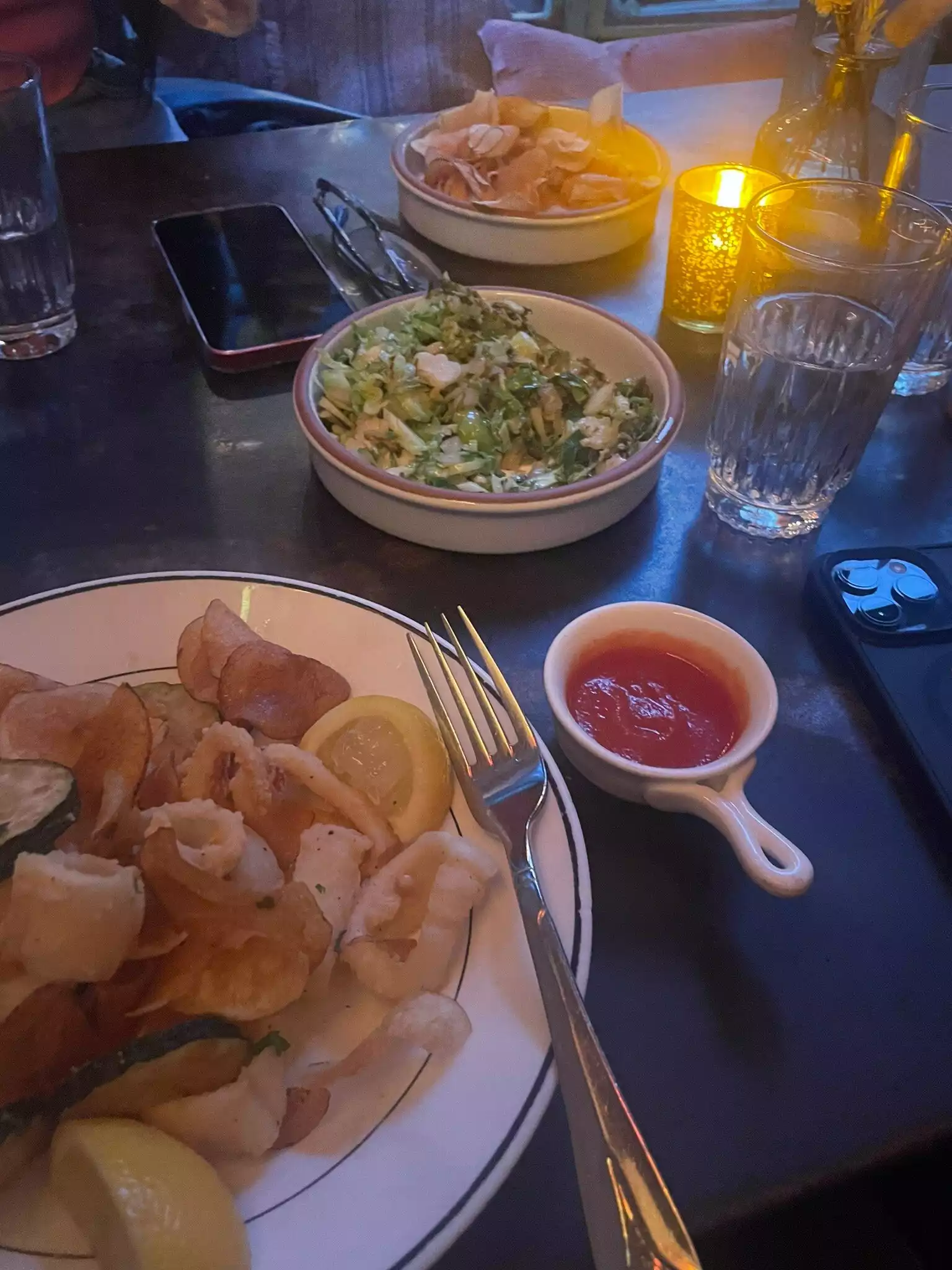 Very cozy atmosphere... Good background music... Yes, a little loud but you're in a small, cozy restaurant in Nolita - what do you expect! We had the tuna tartare appetizer, pumpkin tortelli and hanger steak entrees... Reasonable prices. Two thumbs up!!