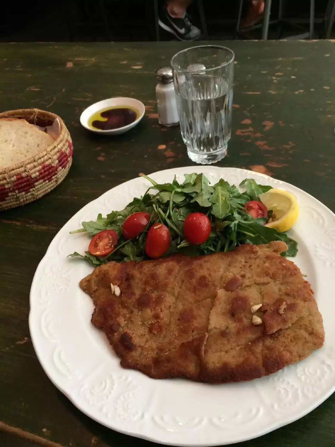 First, free bread with oil and aceto, very good bread (I do rate some restaurants by the bread and this completely aced the bread test). The burrata was exquisite. The kale salad amazingly fresh. The chicken was also quite good. The food took a long time to arrive (the burrata right away but the salad and kale came a looot later). It's also cash only. The wine I think pinot grigio was also great.