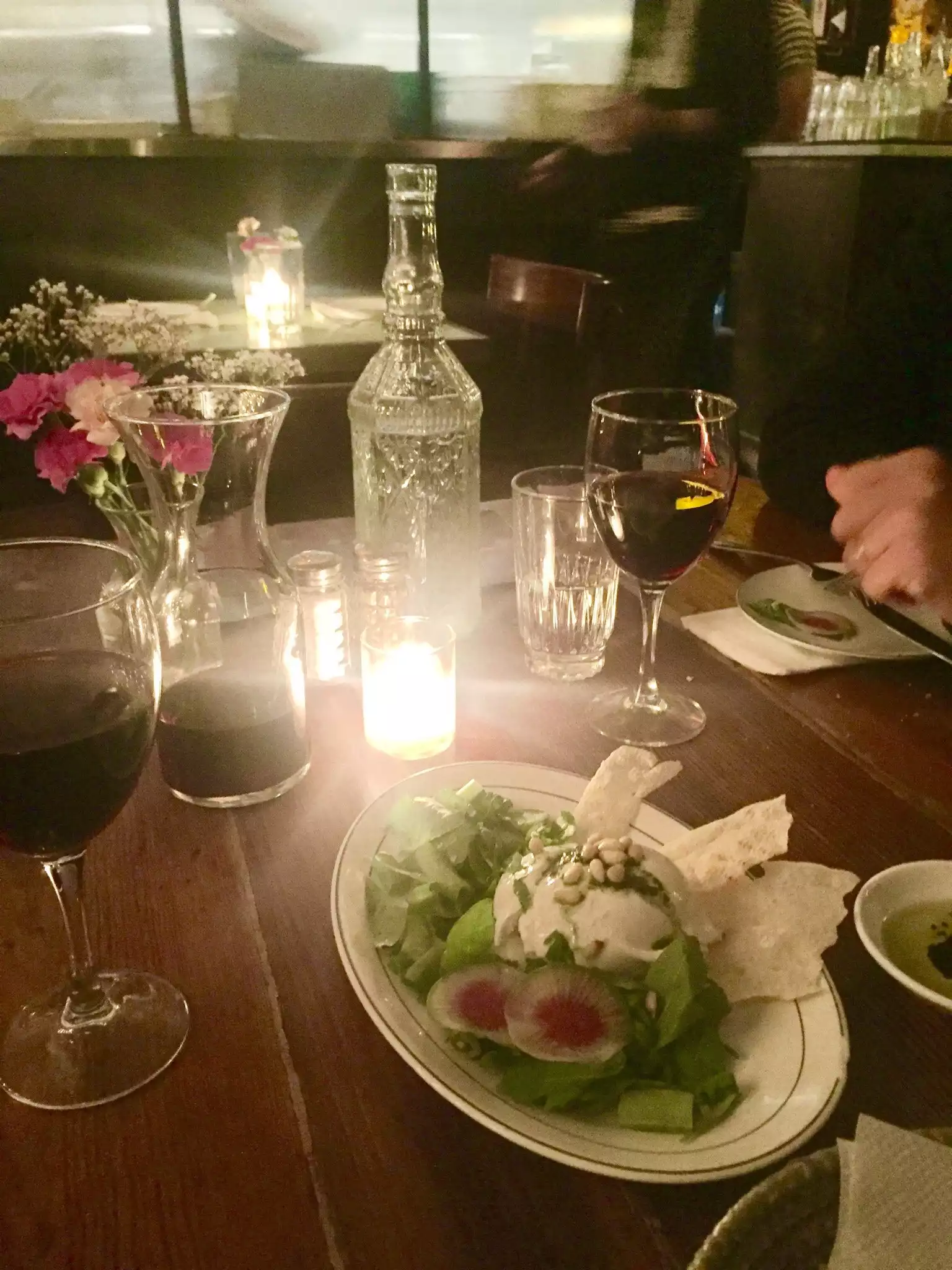 Wandered in this past Friday night at 9:30, and had a wonderful meal! There are so many cute little similar restaurants in this area of Soho, but we loved our experience at Epistrophany! We were sitting right next to the integrated kitchen, which ended up being a lot of fun as we could see all the dishes being prepared. We ordered the burrata and tomato jam bruschetta for a started, which was beautifully presented and very interesting. The tomato jam was really a jam, which ended up tasting very marmalade-y with many notes of orange in it. We also got two salads, one arugula with a balsamic dressing and one mixed greens with citrus dressing. Both had lots of little things mixed in for interesting textures and flavors. We also got orchiette pasta with pesto, because they were all out of the artichoke ravioli. We loved everything, especially the salads! and it was all really fresh and refined and came quickly. Overall, would return in a heartbeat for a quick meal. Less of a place to linger it seems, but super nice for a light dinner with friends.