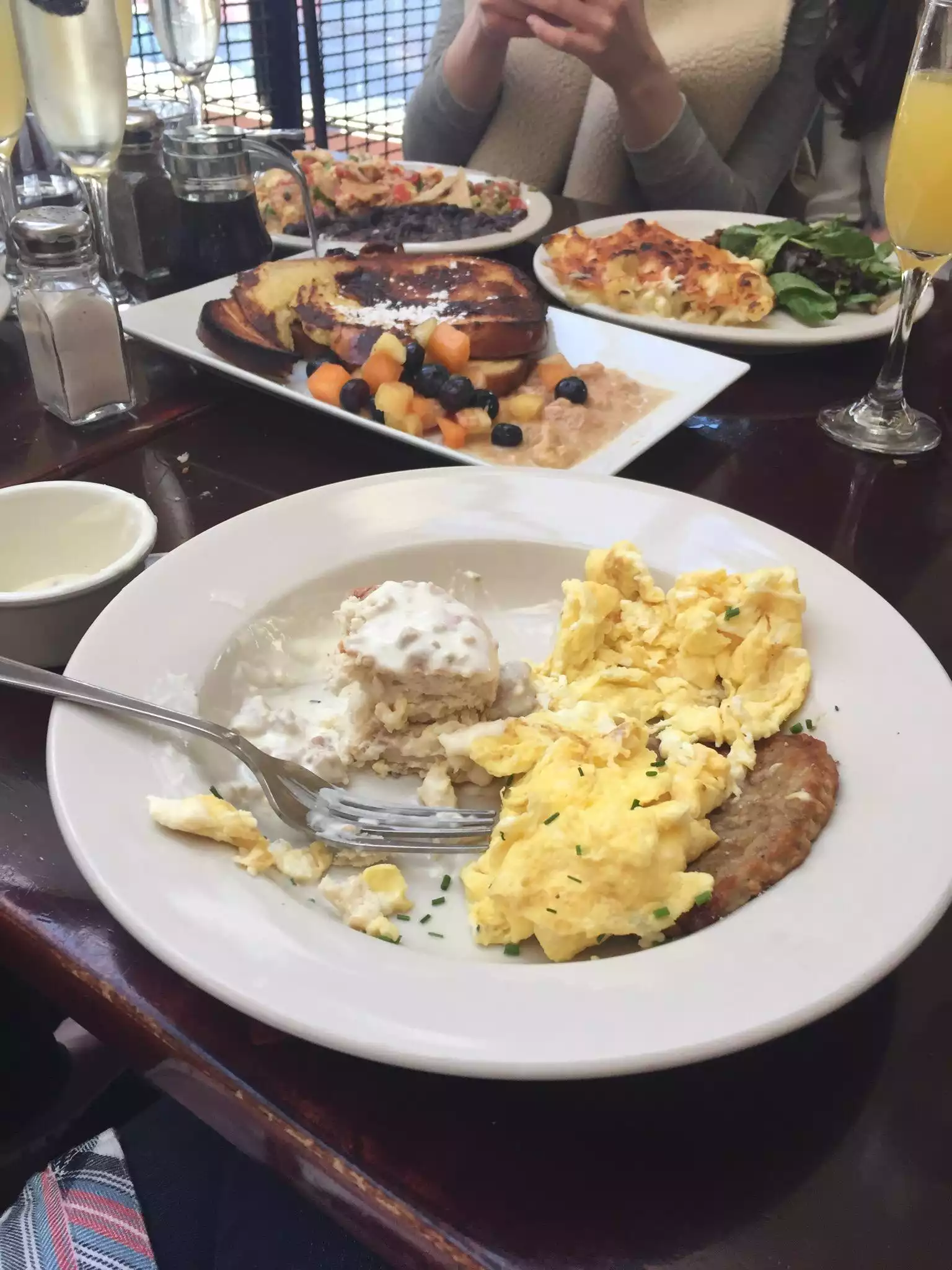 Where do I even begin... I went to Essex for my friend's birthday brunch. We split two dishes — The Southern (chicken-fried steak with a sausage patty, two eggs, sausage gravy and a biscuit) and the Shrimp 'N' Cheesy Bacon Grits (with poached eggs, jalapeño relish, and a biscuit). We then got to taste the Manchego Macaroni & Cheese that our friend ordered. ALL OF IT WAS OUT OF THIS WORLD AMAZING. The biscuits were perfectly textured, the grits had so much bacon and cheese in them, and the mac was the best I've had in years. Not to mention, they take bottomless brunch seriously. The constantly-poured mimosas are more champagne than OJ — just the way I like them. Will definitely be going back!