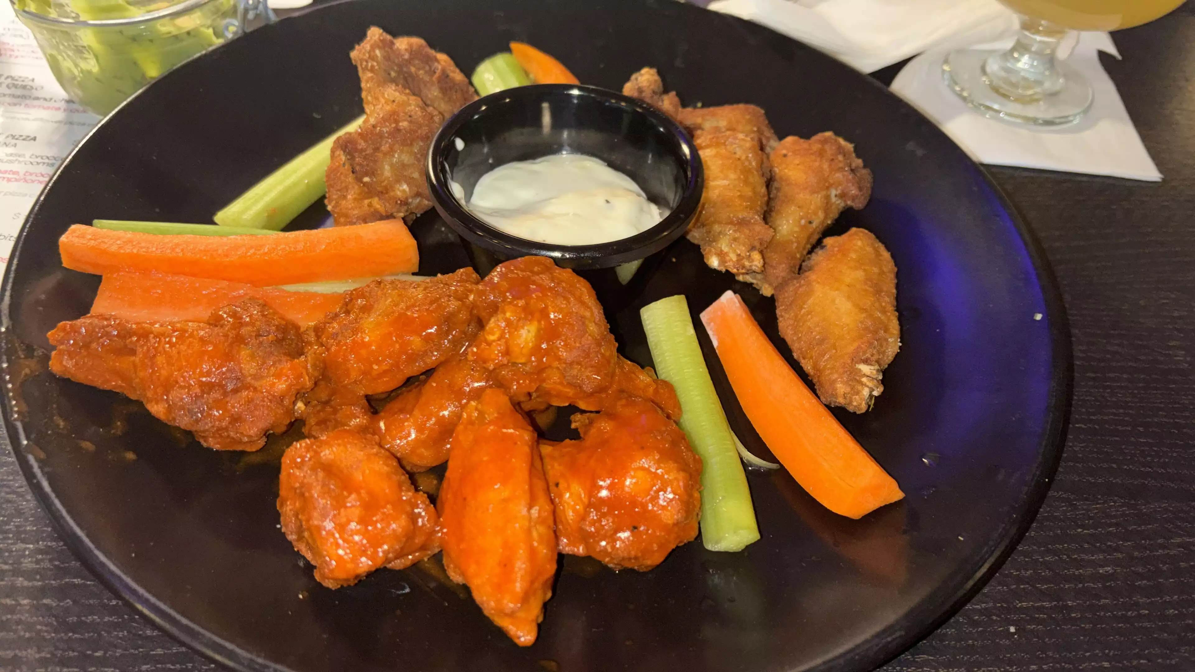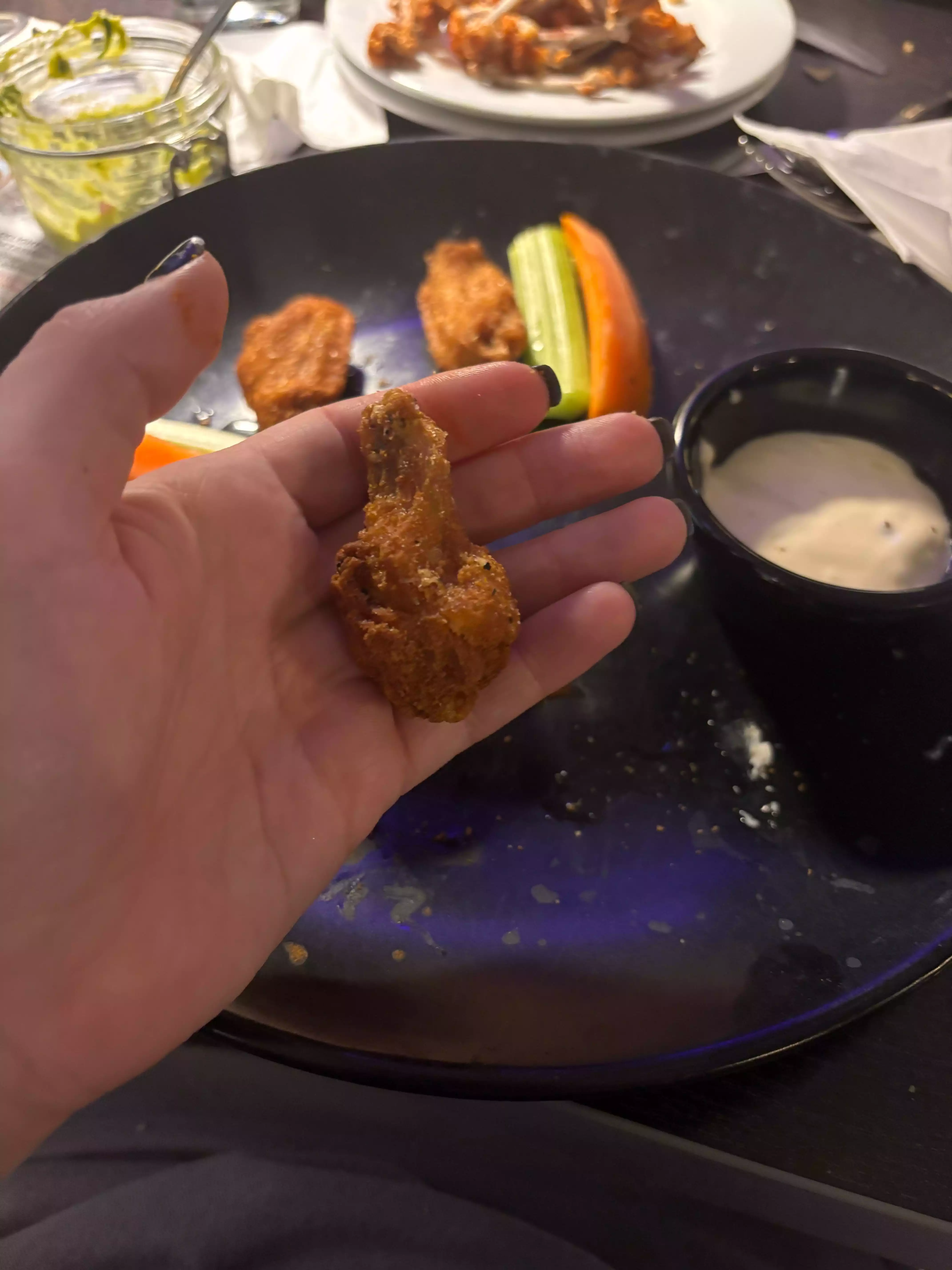 Don’t be fooled by the photos. The wings were small (see photo. I am not exaggerating) and extremely over priced but I have to admit they tasted amazing. Perfectly crispy and juicy inside and the sauce/rub was awesome. However, the pizza tasted really off and funny and we sent it back. The fries were awesome. The cocktail was just ok. And the cake was definitely thawed from frozen. The best food of the entire night was the chips and guacamole and my gods that was absolutely amazing. Fresh made guac with homemade chips and pico. We inhaled it. The real loser here was the absolutely atrocious service. Our waiter came by exactly one time in two hours. And the one time he came by, he was glued to his phone and gave no introduction whatsoever. I had to flag down another server and, at one point, actually go up to the bar to get a water refill because absolutely no one offered or asked if my daughter wanted one. Absolutely no one was stopping at the near by tables either. What should have taken 45 minutes took 2 hours.