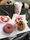 Warning: Resist the urge to shove them in your face until they cool. It tends to be painful if you don't. They have 2 different styles Fresh ones are served hot and tosses in any one of 3 or 4 different mixes of sugar. I had the cookies and cream and it was amazing!!! They're so soft and squishy and delicious. The fancy ones are not served warm since they are glazed and some have toppings. I tried the blueberry pancake one and didn't care for it but I'm used to the fake blueberry of a Dunkin Donuts doughnut. Definitely worth checking out if you're anywhere in the area. Avoid the coffee if you have a sensitive stomach it's very very acidic. Even my coffee addicted fiance wouldn't drink it.