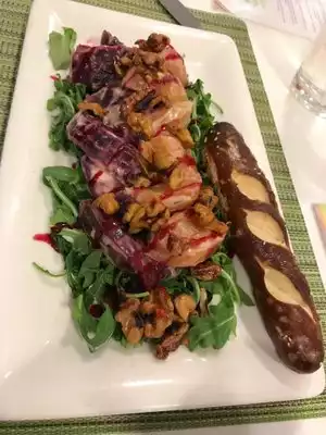 Ate there twice for late lunch. It's like an upscale lunchroom setting. Love the trio platter, and it comes with a pretzel roll. Frozen yogurt used to be included, now its extra. Everything is delicious. I gave it four stars as the service is very slow. It's not a place where you can get in and out quickly. It's a place to lunch.