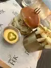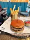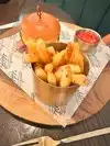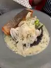 Delicious salmon with Crispy skin and chicken breaded burger with crispy bacon Service was very nice, too. Fries delicious. Who can ask for more?
