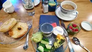 There is too choice a meat and three (eggs as it is breakfast) and three sides or continental, the single orders are lush! And big! Continental, which is not like you London toast and jam, oh no.. Fresh fruit, fritata, bagels, toast, i loved the macha Chia-seed pudding, there is oat meal, overnight oats and that's only bits of it. The deco is modern style diner/home kitchen. The service was great the host spoke both mandarin, swedish/danish, german and english. Would defo come back and recommend!