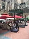 Located in the shadow of the impressive St Bartholomew's Episcopal Church in Midtown Manhattan is this out door cafe, with a large bar on one side. This place is hopping at lunch time. Unfortunately, even though we made a reservation we had to wait ten minutes before being seated. Fortunately, we ended up in a quiet section in the shade. The menu includes salads, burgers, small plate dishes, pizza, and a few large plate options. I had the salmon large plate serving. My mate chicken in a salad of greens. Her small plate was rather large. My salmon was on a bed of seasoned rice and a substantial portion. The fish was close to tasteless.The prices are reasonable by midtown NY standards.
