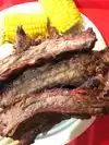Great Sampler Plate.It had tri tip, sausage, and a huge rib. You also get two sides.I had creamed corn and potato salad. Great Location! There is always a line but good things are worth the wait!