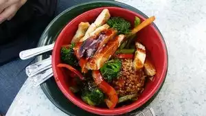 Sure looked good on the menu, but all that showed up was a small piece of steamed chicken breast, some gooey rice and veggies that were both overcooked and undercooked at the same time. That and the lower GI problems that showed up about 20 minutes after we left. Not a good experience. On the plus side, a nice location and a very efficient and friendly waitress. My partner said her pulled pork bowl was ok. But it didn't compensate for my bad order.