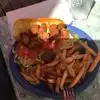 A great floating Cafe in the Columbia River. On a sunny summer day you will find pleasure boats pulling up for takeout or a table. Great views of the boat, duck, and geese traffic on the river. They have mostly outside covered tables with some inside in the bar. They do not take reservations so be prepared for a wait if you come at peak times on a nice day. Still it's a nice place to be waiting literary on the river. The menu is very seafood focused with shrimp cavechi, calamari, and beer battered Alaskan halibut fish and chips. Burgers and wraps and chicken sandwich and strips. All I had were very good. The bar has a range of "island" style drinks and a full bar with draft beer. Overall a great spot on a nice day