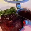 Excellent steaks rivaled by the harbor views ! My spouse had the 20 Oz bone-in ribeye with a brown peppercorn sauce. There was very little fat, maybe an ounce, that my spouse cut off. The steak was flavorful, juicy and cooked to order. I had the trio of filet mignon. Each 3 Oz piece had a different sauce or topping: mushrooms on the 1st beef medallion, lump crab topping on the middle filet, and my choice of fresh green chimichurri on the 3rd steak. All 3 filet mignon were nestled onto a spoon of mashed potatoes with red wine Demi sauce. We also ordered a side of grilled asparagus enough for two persons. Dinner also comes with a hot freshly baked popover. it’s a bread that resembles a hollow muffin. Excellent steak house! Excellent water views! Attentive service! Only thing missing is live music from a pianist. Just a suggestion.