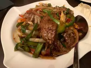 Hostess: We had a party of 9 dining on a Sunday evening for dinner. The hostess was able to accommodate our large party with no reservation. We were served water immediately and our hostess was very good about returning quickly to take our orders. She was busy working a lot of tables and was able to refill our waters and see if we needed any additional items. Interior: This is a pretty restaurant with wine bottles on display. There is a sushi bar in the main part of the restaurant. Food: The menu is quite eclectic array of Asian cuisines. We ordered Black Peppercorn Beef, Shredded Pork Pan Fried Noodle, and Shanghai pork soup dumplings. The entire table was provided with a bucket of rice to share. We requested that the black peppercorn beef to be served extra spicy. The beef had onions, peppers, jalapeno slices, and green onions. It had a nice flavor. The beef was of good quality and the crunch of the vegetables made the dish has good texture. The portion was very generous. The shredded pork pan fried noodle dish was bland. The texture of the noodles at first were nice and crunchy, but they got soggy very quick. The sauce had too much cornstarch and was goopy. The shredded pork concerned me, some bites of the dish tasted like shrimp, then chicken. I added some of hot sauce from the Shanghai pork soup dumplings to the shredded pork, but it did not help. The Shanghai pork soup dumplings had no flavor. If you want authentic Chinese food, this is not the place. Bathrooms: very clean