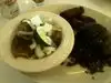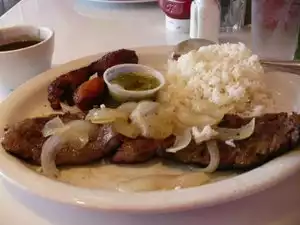 We ordered the Chicken Strips and the pork... comes with two sides.. got the rice and had them pour black beans over the rice. Wow... great stuff. Don't forget the sauce...as it can be a little dry. Two could easily split one order.