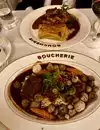 FANTASTIC first experience with Grande Boucherie this Christmas season. The restaurant itself is beautiful. A very grand space with a gorgeous bar, gorgeous ceilings, and elegant dining tables. It has to be one of the largest fine dining restaurants we've ever experienced. When we first walked in and were seated, I got a little worried that a restaurant this large and this busy would be disappointing in service and food quality - - but WOW did they ever prove me wrong! We had a fantastic server, Jouan, who gave us his full attention despite being very busy, and never left us waiting for anything. Such a fun personality, super nice, and very professional! The timing of drinks and dinner was perfectly paced. We were interested in getting a bottle of wine and of course they have a large selection. We were approached by the sommelier (I believe her name is Pauline) who asked all the right questions (without any pretense). I relayed my preference....super dry red, not jammy and despite that unsophisticated description, she found the perfect bottle in our price range. We had a nice comfortable chat with her about wines, preferences, etc. Now as for the food - - WOW once again they proved me wrong by delivering two beautiful dinners! My husband had the lamb rack and I had the beef bourguignon (recommended by Jouan). They were both very good! It still amazes me how a restaurant of that size, could put out such good food, served at the right temperature, in a timely manner. At the end of the dinner we had a chance to talk to Marta, the general manager, and I relayed all the good stuff discussed here! I could tell talking with her, that she is one of the reasons that makes the Grande Boucherie such a wonderful restaurant. Great serving staff (good hiring & training), great kitchen staff that work together to put out beautiful food, and management that keeps everything running smoothly no matter what the night throws their way. We'll be back!