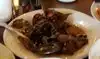 We had the cherry chicken,very spicy and crisp, and fragrant tripe cold appetizer,an aquired taste. Is pricy but recommended by native chinese as the only worth trying in the village.There is a bar but no ambiental music.Will return here.