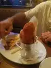 The food here is real tasty! For appetizers we had the Fried Deviled Eggs which was different but good and we had the Brussel sprouts which were amazing. Had a lot of flavor (Parmesan cheese and garlic and chard). For the meal I had the dirty dog which was good as well. Hard to eat so I ate it using knife and fork but was good nonetheless.
