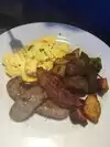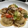 I had the New York steak and fries. The steak was over cooked and grisly and the fries were so so . My husband had the duck ravioli. Neither meal was very good.