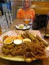 I bought the blackened fish with mashed potatoes. It was delicious. The server was friendly and helpful. I ordered this dish to take to my room and she made sure I had everything I needed before I left.