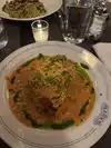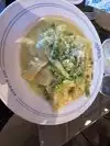 We stopped by prior to our reservation time, and were immediately seated. The place was bustling with a lunch crowd. We were offered a variety of waters, and requested tap. Bread was served and it was good with the butter. Ordered the Ravioli Alla Primavera and easily finished it. Different servers stopped by to take our orders, replenish the waters, deliver the food, and pick up plates afterward. Hope tips are shared across the different servers.