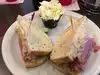 We have bought bagels there a number of times and loved them. They usually do a bakers dozen (13). This was our first visit to sit down to eat. We had to wait 45 min in the middle of a Saturday afternoon. We should have reserved on the app. We each had Reuben sandwich’s. My wife’s had a mix of corned beef and pastrami and mine was all corned beef. I had a Dr Brown diet cream soda that I had as a kid. The sandwich’s were great. A woman a nearby table had a burger fries and shake all served in a giant shake glass. Looked great! Our server was attentive and polite.