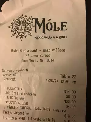 Mole is in the same block of Hudson Street in the West Village with a couple other restaurants we like and we've been wanting to give the Mexican place a try for a while. (They don't seem to be open for lunch). Overall, the place was a big disappointment. You would expect a place called Mole to offer a lot of dishes with that particular sauce. Not the case. Strike One Strike Two -- the chips and salsa--chips are not made in house and they were stale (maybe the cooking oil was rancid) AND the salsa was clearly out of a jar and pretty boring. Strike Three - The entrees. One of us ordered Oaxaca style crepes with mushrooms. Waiter returned 10 minutes after the order to say there were no crepes that night (Monday--the beginning of the week), but they could put filling into a quesadilla. So OK, except that turned out to be two small taco shells stuffed with a bland mix of chopped mushrooms and something else. Dining partner order a small plate tamale that was just okay, but probably the best part of the meal. Strike Four - I ordered a Tecate beer (no Dos Eques) which came in a can, but was brought without a glass. Requested piece of lime was miniscule. We had a friendly waiter, but the place lacked everything else. I don't understand how the place survives in a foodie town like NYC. We would never go back..