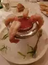 Food was delicious, we had the prosciutto wrapped mozzarella cheese as an appetizer. Then the lobster bisque soup, we had the mixed grill with Filet Mignon, 2 shrimp, and two bacon wrapped scallops, for dessert we had the chocolate soufflé for dessert. Everything was great. Steak cooked to perfection. We were greeted by Gina, Leonard, and Jessie. Our server was Matt and he was amazing. The entire staff was great. We were celebrating our anniversary.