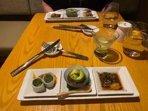 Excellent experience. While we were waiting for our seats at the bar, we were able to enjoy excellent people watching. Highly recommend. 10/10 recommend. The salmon belly sumiso was lovely. The Caesar salad was also quite tasty with a wasabi truffle dressing and puffy cheese croutons that are still warm. We loved the Wagyu nigiri, scallop nigiri, red snapper dry miso, and the Wagyu tacos. The service was impeccable. The bar staff were super friendly and helped make thoughtful suggestions.