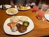 Very good location, very good service, very good food... rib eye cooked medium-well just as I ordered. Total for steak, choice of potato, side order, and strawberry lemonade was $28 before tip.