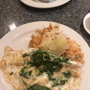 Great service and very nice egg white omelet, enough hash browns to feed a crowd, great coffee, and airy waffles.