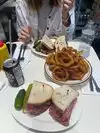 My wife an I were in New York City for just 3 days and ended up eating here twice - it was that good. The first time we went for lunch and had the overstuffed Pastrami and Corned Beef sandwich... so big that it fed both of us. We ate in the restaurant, so they served us pickles on the side... I guess that's a New York thing. Those were good too. But the sandwich was amazing! Every bite was flavorful... and like I said, so good, we came back a 2nd time during our visit. The second time we tried a side dish of Onion Rings.... also amazing. The plate was huge! The onion rings were perfectly done... not greasy or overly oily (not the same thing).