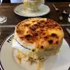Great food, great menu, exceeded our expectations. Drove up here with our tour guide on his suggestion--he told us don't let the strip mall fool you. He was right. Awesome seating, just like you are in Paris. Cozy, comfy, and small, like a French cafe. Staff knows the menu inside out, and the specials, and the menu is not too large. Portions are perfect. I had this avocado halved, stuffed with shrimp that was coated with vinaigrette and delicious, and French onion soup. I was full until 11 pm. Great food.