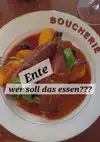 I had decided on the duck breast and was very surprised at the size/amount of the meat at first... 2 large pieces of meat in a delicious sauce, with apple slices and cherries.... I had already wondered about the big saw knife, but without it I wouldn't have gotten through! The meat was rubbery interspersed with tendons (42$). I claimed and decided to use the Caesar salad. It consisted of green leaves, little cheese, 4 sour pickled anchovies, vinegar/oil... nothing else!! for 20$ the glass of wine cost 21$