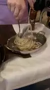 Looking for Italian food, we found the restaurant on Google. We arrived at 7:30 p.m. and were able to get a seat inside about 30 minutes later. The dishes (lasagna for me and caccio e peppe) arrived quite quickly and the pecorino pasta was plated before our eyes, after having been prepared on the wheel! It was very surprising, we loved it. The flavors were there, we savored every bite! But the most surprising thing was to see our tiramisu arrive “in pieces” and prepared before our eyes once again! A real experience that we can only recommend!