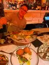 Got interested because it’s a Sicilian menu. And that’s where we are planning to go on our next big vacation!! Originally we planned to eat outside on the small outdoor 2 nd floor terrace, but the 90’ changed our minds! Chose the more elegant 2nd floor dark and sultry dining room! Ordered pulpo appetizer- BEST one ever! Swordfish- not that great- previously frozen & $40. Gluten free penne pasta with langostinos, burrata and basil- fabuloso! Don’t bother ordering the gf bread- it’s regular toasted slices multi grain sandwich bread! There’s a nice vibe upstairs- even has another small bar there- we will return and both get pastas next time! The Sicilian hostess ( pictured) was SO friendly and very loud, haha!