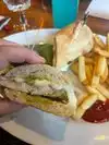 Good place for a bite away from the insanity of TS. Friendly service and good food. Chicken sandwich with roasted peppers and pesto made for a nice lunch. The person next to me had the entree fish and chips and looked great!!