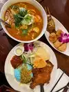 Malaysian spot with tasty, authentic options. Anthony Bourdain had been here before for the Sarawak laksa, and that’s exactly what I got. The broth was nuanced and immensely flavorful. Note that it does have shrimp. It was so good that even when my dad had some soup go down the wrong pipe, he still kept eating the soup in between coughing. The Malaysian combo came with 2 of each item - chicken satay, murtabak (these little potato pastry things), and curry puff pastries (note there’s meat inside). My mom got the Nasi Kerabu with fried chicken and loved it. It came with blue rice, which was pretty cool, and the chicken was well done - lightly crispy on the outside, juicy on the inside. The mango smoothie was a bit icy but I liked how they added a bit of whipped cream and strawberries on top. Credit cards are accepted. Indoor and outdoor dining is available. Two gender neutral bathrooms are available in the back. They do have alcohol; the Mekong whiskey was earthy and my dad enjoyed his neat. It’s good for big groups as well as one-on-one hangouts, and they do have takeout. Overall, highly recommend grabbing food at this place whenever you’re craving something flavorful.
