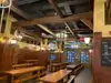 This hall is similar to a Bavarian Beer Hall with large wooden tables. You get more than 10 classes of draft beer from Bavaria and from other parts of Germany. They serve Bavarian fare too, like pork knuckles, sausages, etc. Beer just perfect temperature - refreshing. They should serve some appetizers with the beer, then it would be perfect. Nice girls behind the bar serving nicely the beer. It is noisy...