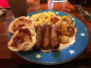 True Texas breakfast. Love a buffet with biscuits plus of course the assortment of pancakes, bacon, sausage, and a variety of eggs including made to order. The setting is lovely reminiscent of a west Texas ranch house.