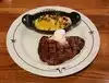 Our group had a variety of items and all were good. Mushrooms and medallions - very good Ribs and shrimp - Excellent Chicken fried steak - Good (more late) Salmon - tasty We went for lunch on a Sunday. The place was slowly filling up, but not crowded. The staff was pleasant and everyone greeted us when we entered. Overall, everything was ok. The food was good, the portions were good size and the service was fine. The only criticism relates tot he server checking tthat what he brings to the table is matching what was ordered. For example: My chicken fried steak was huge, but was served without any gravy! Who serves something like this without lots of gravy? I had to request gravy twice and then ask for more when they brought out a tiny cup of gravy. I know this sounds picky, but come on...it was a chicken fried steak!! The portions for all dishes were good size. The lunch menu is not available on the weekends, so dinner portions and dinner prices. Not much is less than $15.99 plus $3 drink plus tax and tip. The bill for three of us without dessert was $85 for a lunch!! Overall good food, but procey!