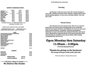 Went to Sammy's for a private party and the food was excellent especially the spare ribs that were so tender they melted in your mouth. The brisket was fine, but the sides of potato salad and desserts were great. The staff was especially attentive.