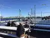 Huge outdoor covered space of picnic tables on the Port of LA. Not incredibly picturesque but nice enough view. The deal is choose from an incredible assortment of fish and seafood by the pound. Add sides of veggies, potatoes or both. Then take your choices to the prep area where everything is seasoned , cooked on a flat-top and served on paper lined cafeteria trays. Calamari and soups are prepped at next stand. Everything is delicious, a bit rustic and very crowded with locals....I expect on weekends it would be SLAMMED, so stick to week days . Prices are very reasonable. Do choose carefully, some of the product looks fresher that others, you get a good look at the fish cases. There are a number of concessions, most look similar. Good enjoyable experience, just don't expect "dining"...