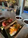 Busy place so make a reservation! Expensive ambiance. Knowledgeable bartender with great suggestions and drinks. Friend/Business dinner for 6 - quality service, beautiful and delicious sushi,etc. Served on one long board, length of our table for sharing. Started with garlic edamame. Trilogy, and Distinguished gentleman were my favorites. Yellowtail was superb. Ordered a side of Tobikko roe - small bright salty roe with no fishy taste.